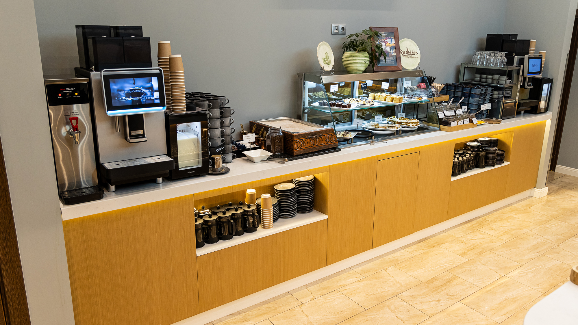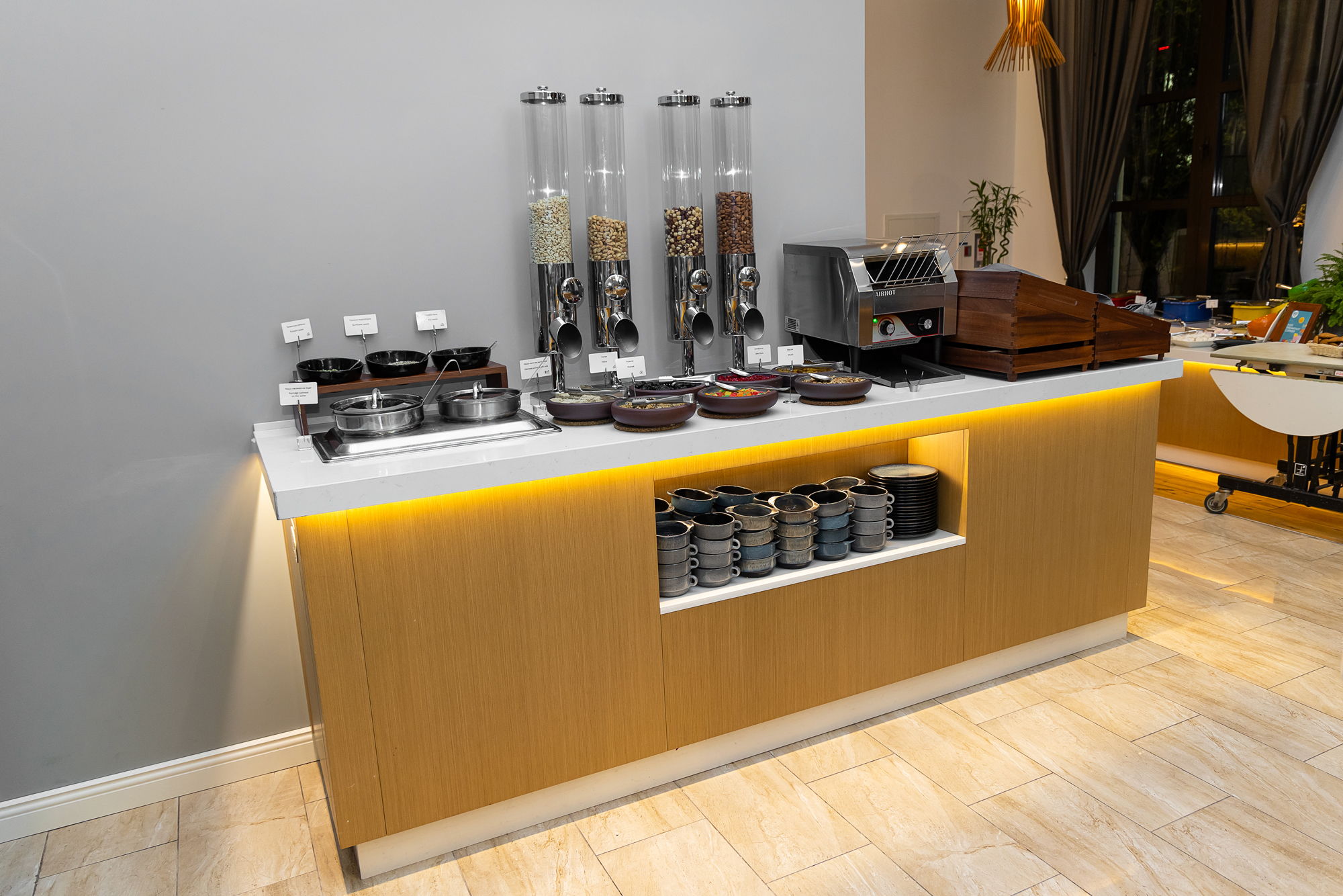 Шведская линия Radisson Rosa Khutor выполнена по индивидуальному заказу и идеально вписана в существующий интерьер зала.❄️ Охлаждаемые поверхности изготовленные из кварцевого агломерата с скруглёнными углами, повторяющими скругление столешницы и корпуса модуля для холодных блюд.